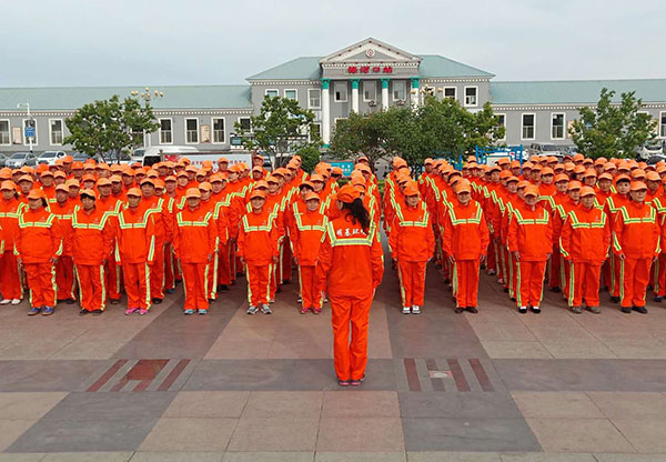 機洗(洗掃車洗掃吸一體)→機保(保潔車巡回保潔)→人沖(手持槍沖洗人行道)→人工(人工清掃保潔) -